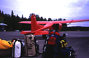 On return from dumping Strappo and crew, he had not viewed the Spires, but was willing to give it a try. Trying to pack our sizable racks, portaledges, food and fuel seemed to cause Mr. Hudson great amusement. Our load amounted to four big haul bags and four smaller packs. Calder, his father Lynn Stratford and I crammed everything into the small red bird. Our bush pilot only allowed 850lbs per aircraft, but was less than scientific about evaluating this sum. Choosing only to eyeball and guesstimate the total, bulk seemed more our problem.