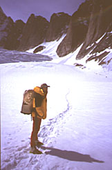 The next morning brought frenzy, Lynn's bush plane was due to arrive, and once there, he was not eager to stay. Excitedly, we packed Lynn into the plane, hoping to hitch a ride over to Middle Triples East Buttress, but were informed that no landing was available on that side. Rats! Dejected as we gazed up to the col, it glowered from its aspect three thousand feet above. Dividing loads between pack and sled, we bolstered dwindling psyches and tramped towards our obscured goal. We were not quite traveling light for a sub 24 hour ascent. The col was guarded by yawning crevasses and very steep snow. Gravity favored the sleds weight over our forward motion.